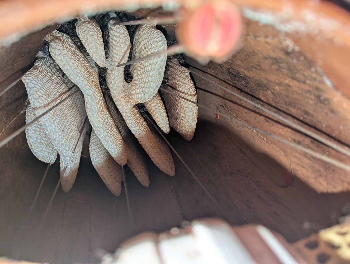 At the beginning of April, I gave my honey bees in the HIIVE vitamin sugar water once and continuous feed dough. I wanted to promote the health of my bee colony and be 100% sure that they would not have any supply bottlenecks in the HIIVE. As a result, my honey bee population in the HIIVE exploded and the combs that were built to mid-height in the brood chamber of the HIIVE were built to the floor in the brood chamber of the HIIVE. The fifth picture shows the situation where the combs were built to the end of the brood chamber in the HIIVE.